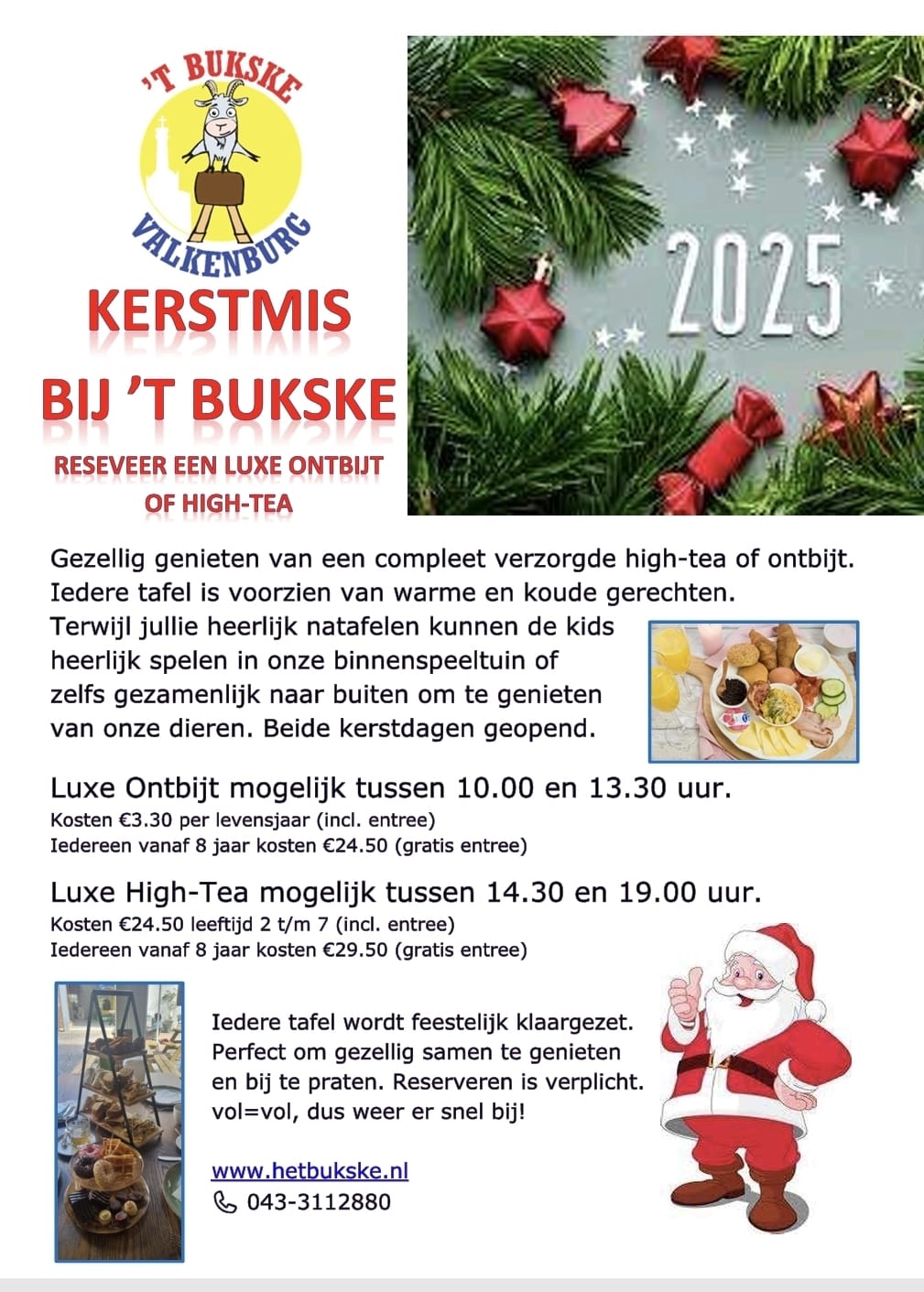 Luxe kerst ontbijt en high-tea 25 december Donderdag 25 december 2025 Kinderspeelboerderij 't Bukske Reserveren kan via onderstaand contactformulier. Aanmelden voor het ontbijt of de high-tea Ontbijt of High-tea Selecteer ontbijt of high-tea Luxe ontbijt High-tea Selecteer een tijd tussen de 14:30 en 19:00 Tijd Selecteer een tijd tussen de 10:00 en 13:30 Tijd Naam Volwassenen Kinderen E-mail Telefoonnummer Aanmelden